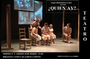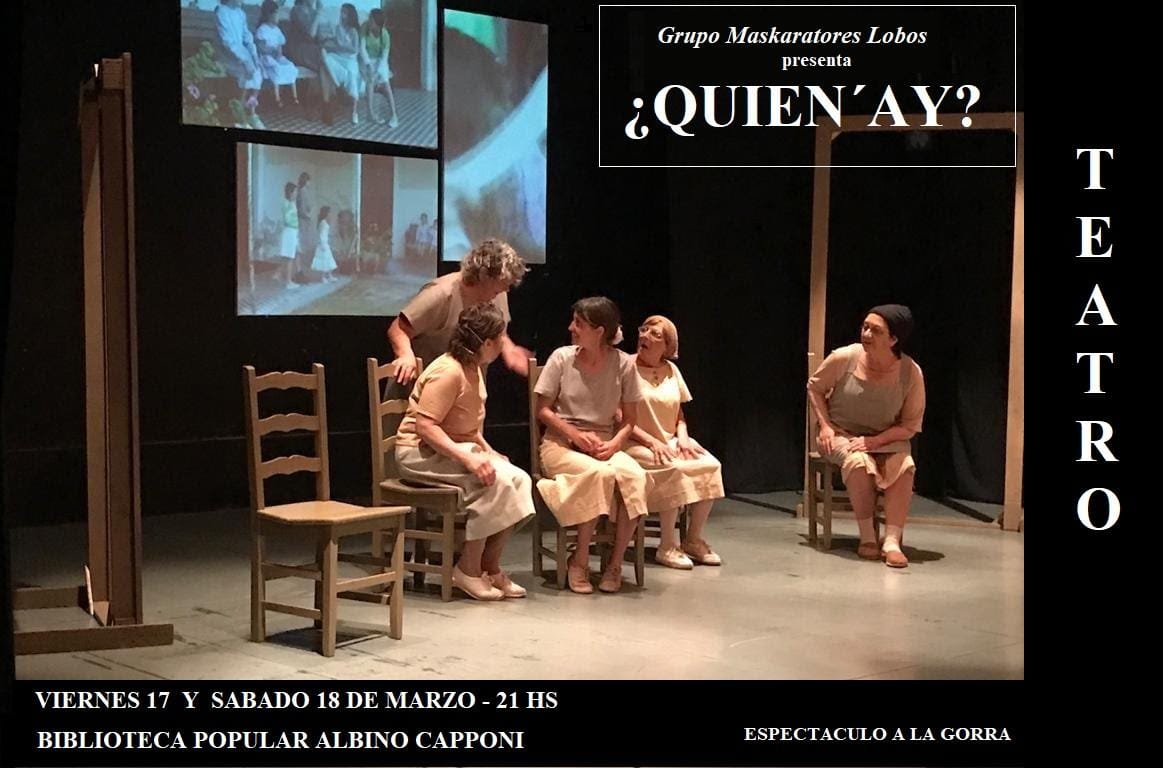 La Biblioteca Popular » Albino Capponi » y el Grupo Maskaratores Lobos invitan a Ustedes y a la Comunidad, a disfrutar de la obra ¿ QUIEN ´AY?, este viernes 17 y sábado 18 de marzo a las 21 hs en nuestra sede de Rivadavia 36.