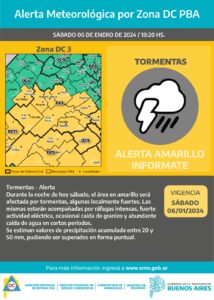 En el mismo se anuncian probabilidades de fuertes vientos, con ráfagas de extrema velocidad, posibilidad de caida de granizo y una importante cantidad de precipitación de agua en cortos lapsos de tiempo.