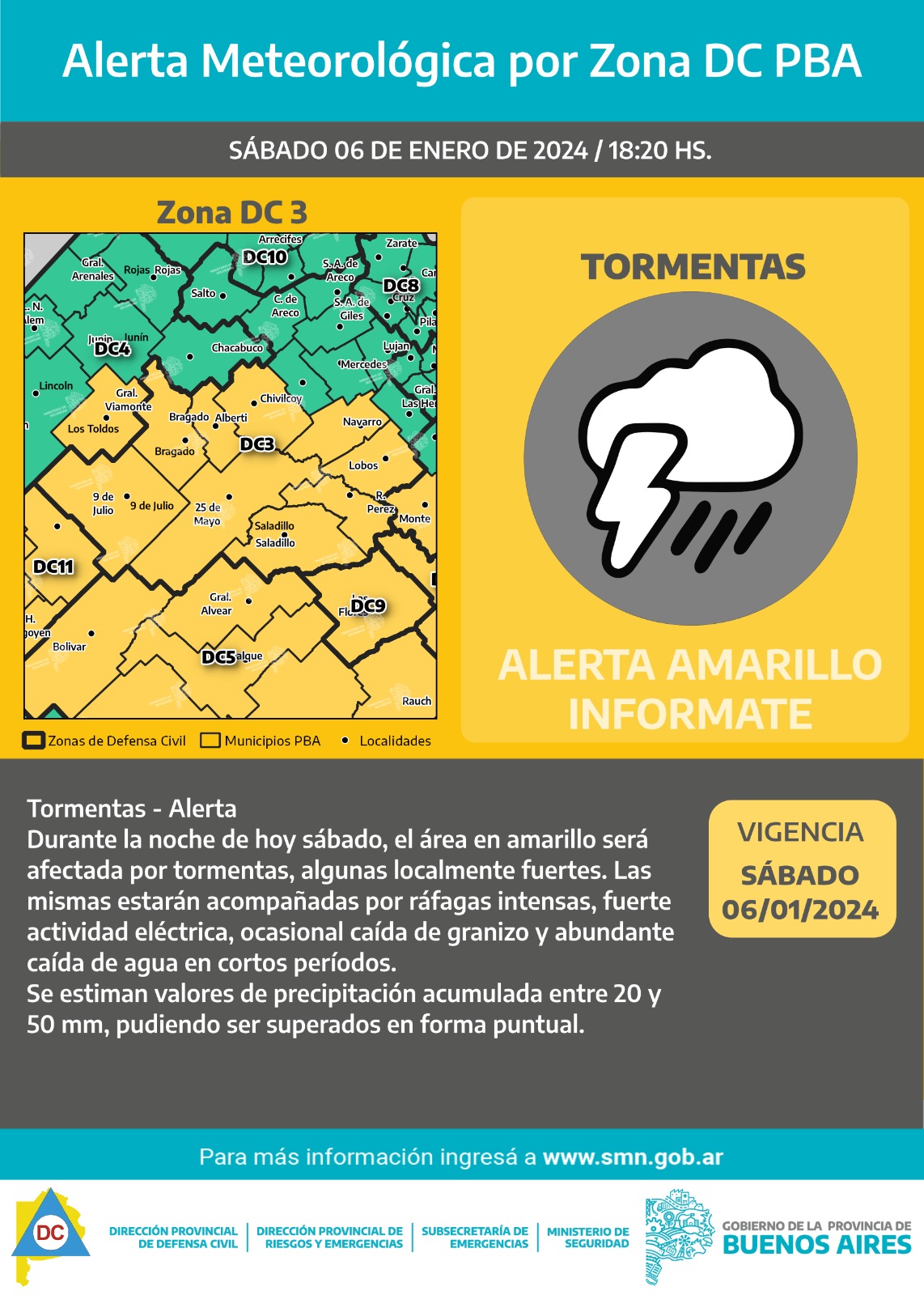 El servicio meteorológico lanzo un estado de alerta para la noche de este sábado para Lobos y alrededores.
