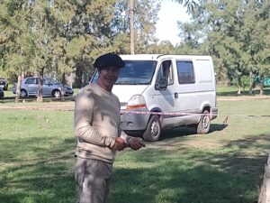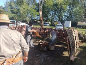 El sol mañanero le comenzaba a poner brillo a los preparativos. En la entradita nomás, nos encontramos con el amigo MAURICIO ROMANELLI quien, con su atuendo gauchesco, nos saludaba muy cerca del fogón donde preparaban los costillares para el mediodía. Allí, sobre un amplio tablón, esperaban los chorizos y menudencias que completarían el almuerzo.