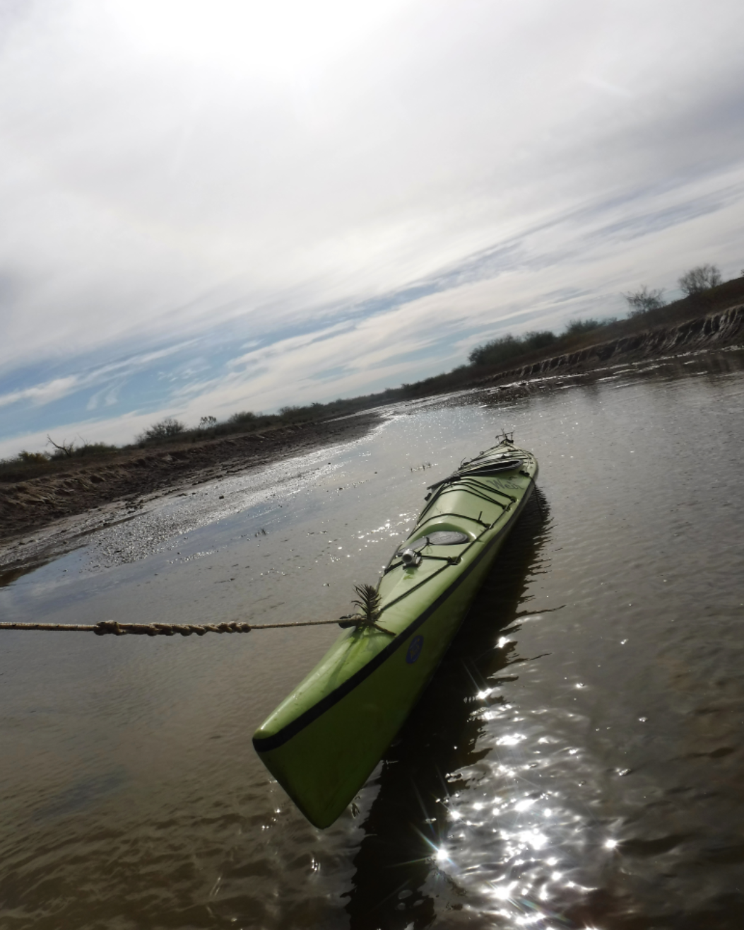 A solo 50 metros, se veía el primer alambrado que cruzaba. El agua fría, verdosa, con poca profundidad. Esto se fue agravando a medida que pasaron las horas…. Sí, las horas… El suelo es de tosca con piedras, una combinación no apta para arriesgar el casco de los botes. A nuestro paso se abría un pequeño terraplén con acacias otoñales, cardos y abrojos y muchos arbustos poco amigables con espinas gruesas. Las capas de tierra más bien claras con pinceladas de salitre y en el agua asomaban furiosas puntas de piedras y tosca con forma de caparazón de tortugas. El agua corría de vez en cuando y se volvía a estancar cuando esta cordillera de piedras asomaba.