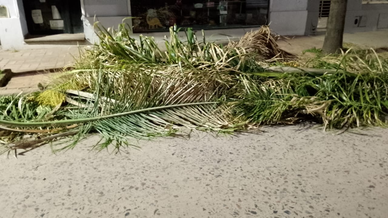 La vereda y parte de la entrada se encontraba tapada con la fronda de poda de dos palmeras que se encuentran frente al local.