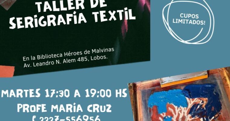 La Biblioteca Héroes de Malvinas, nos comparte el nuevo taller de SERIGRAFÍA TEXTIL, que se dictará en sus instalaciones los días martes de 17,30 a 19. Informes 2227556956 CUPOS LIMITADOS.