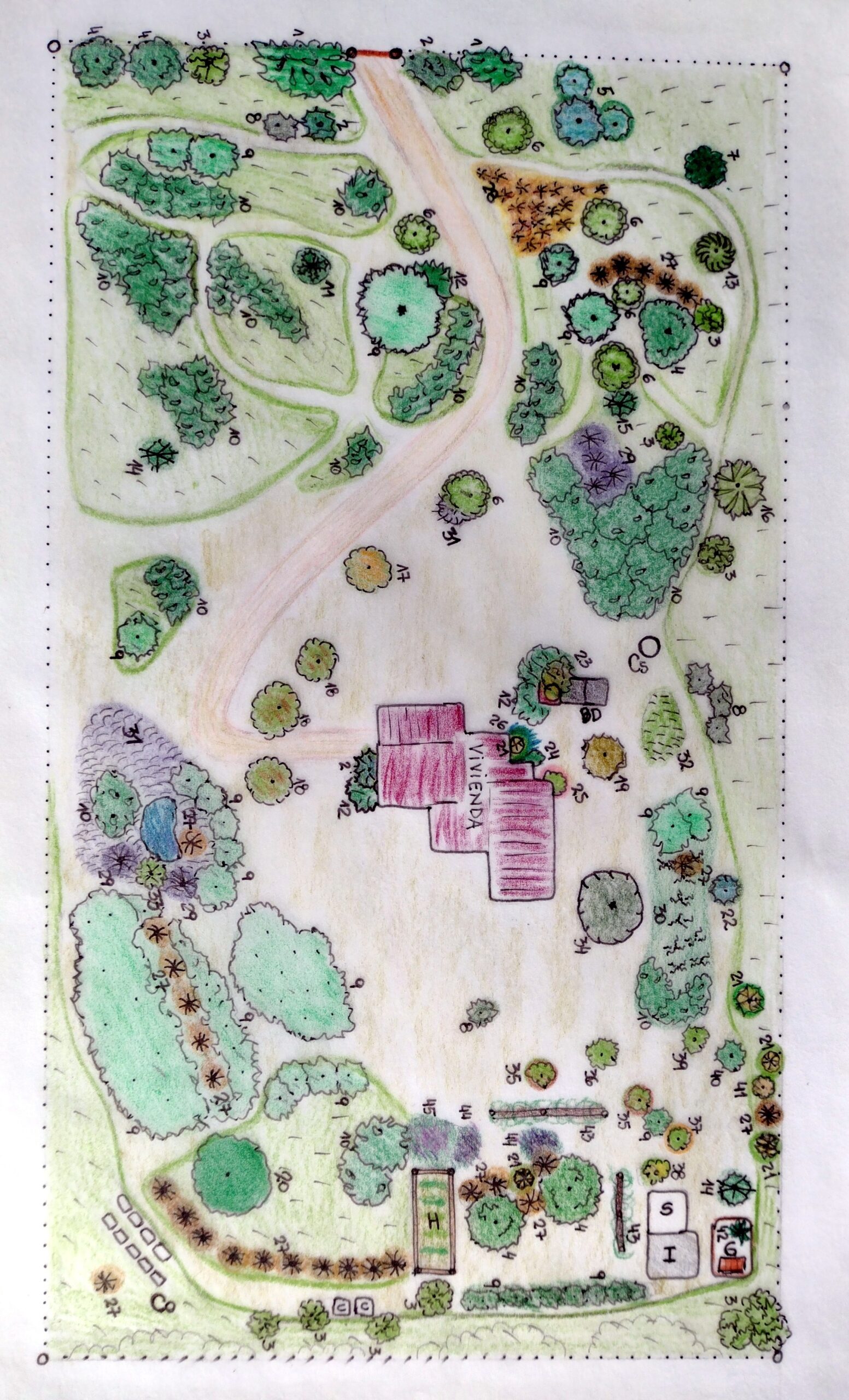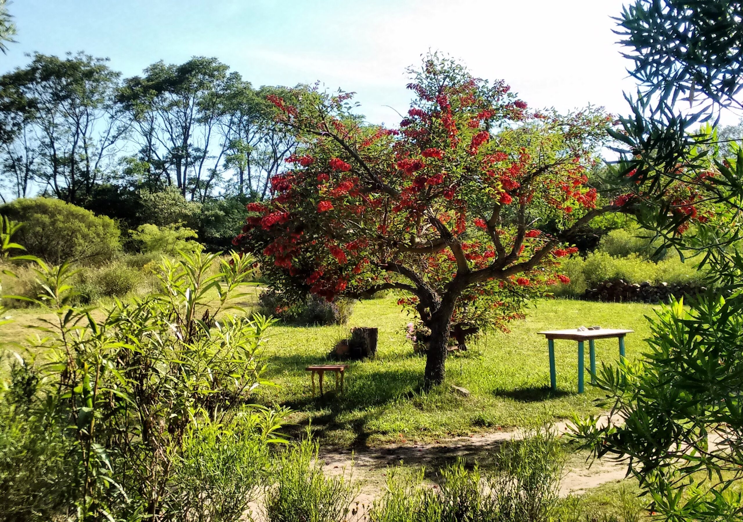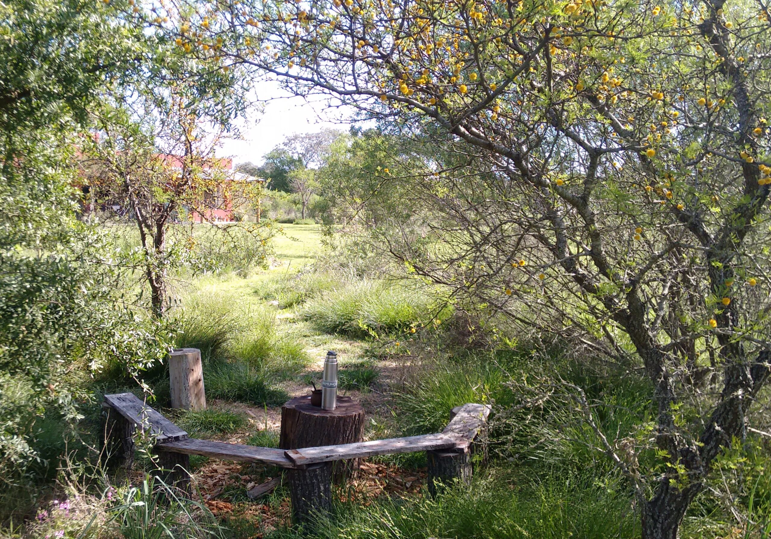 Partimos de un predio de 5000 m² ubicado en zona periurbana, que previamente fue pastoreado por caballos a lo largo de varios años y por lo tanto con muy poca vegetación y suelo compactado. En el diseño del paisaje que rodea nuestra vivienda incorporamos plantas nativas del pastizal pampeano, bosque de tala y de humedales que, según las descripciones de historiadores y naturalistas, estaban en el lugar antes de la llegada de los colonizadores. Buscamos así aumentar la biodiversidad de nuestro lugar y su entorno. Año a año fuimos sumando especies de plantas nativas en el terreno intentando reproducir las comunidades florísticas originarias, procurando un espacio verde de bajo mantenimiento. Distintos senderos atraviesan arbustales con chilcas y pequeños montecitos de descanso y contemplación, generando un “laberinto natural” ideal para el juego de niñas y niños.