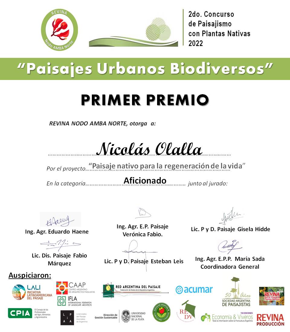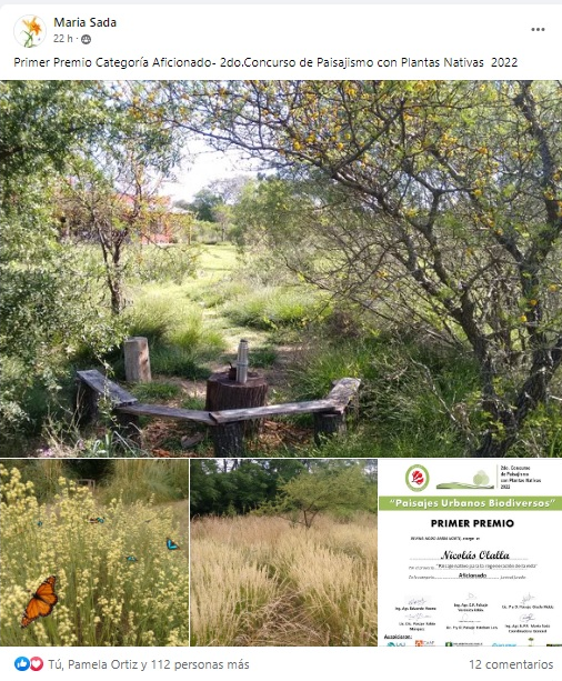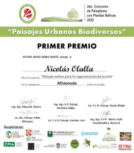 El pasado 12 de Octubre de 2022 tuvimos la gran noticia de haber alcanzado el primer premio en categoría amateur del Concurso de Paisajismo con Plantas Nativas 2022 “Paisajes urbanos biodiversos”, organizado por la REVINA (Red de Viveros de Plantas Nativas) y apoyado por diversos espacios e instituciones como Iniciativa Latinoamericana del Paisaje (LALI), Consejo profesional de Ingenieros Agrónomos (CPIA), Sociedad Argentina de Paisajistas (S.A.P.), Red Argentina del Paisaje (R.A.P.) y el Centro Argentino de Arquitectos Paisajistas (CAAP-IFLA), por citar algunos.