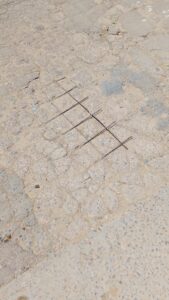 Fíjense ustedes, la malla al ras del piso, el concreto deteriorado por que seguramente la mezcla no es la correcta.