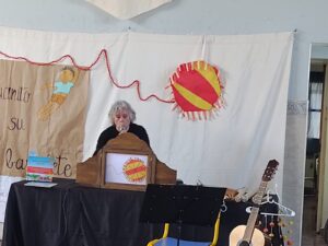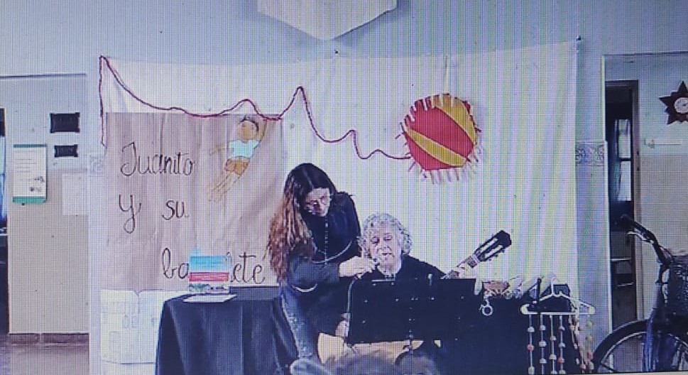 Es que, SILVIA CADENA, autora del libro infantil, JUANITO LAGUNA, estuvo presente contando este cuento que, además, lo hizo con una serie de imágenes en un pequeño teatro chinesco. Primeramente despertó la atención de chicos y grandes con una canción que puso de manifiesto sus voz y su música, acompañándose ella misma con la guitarra.