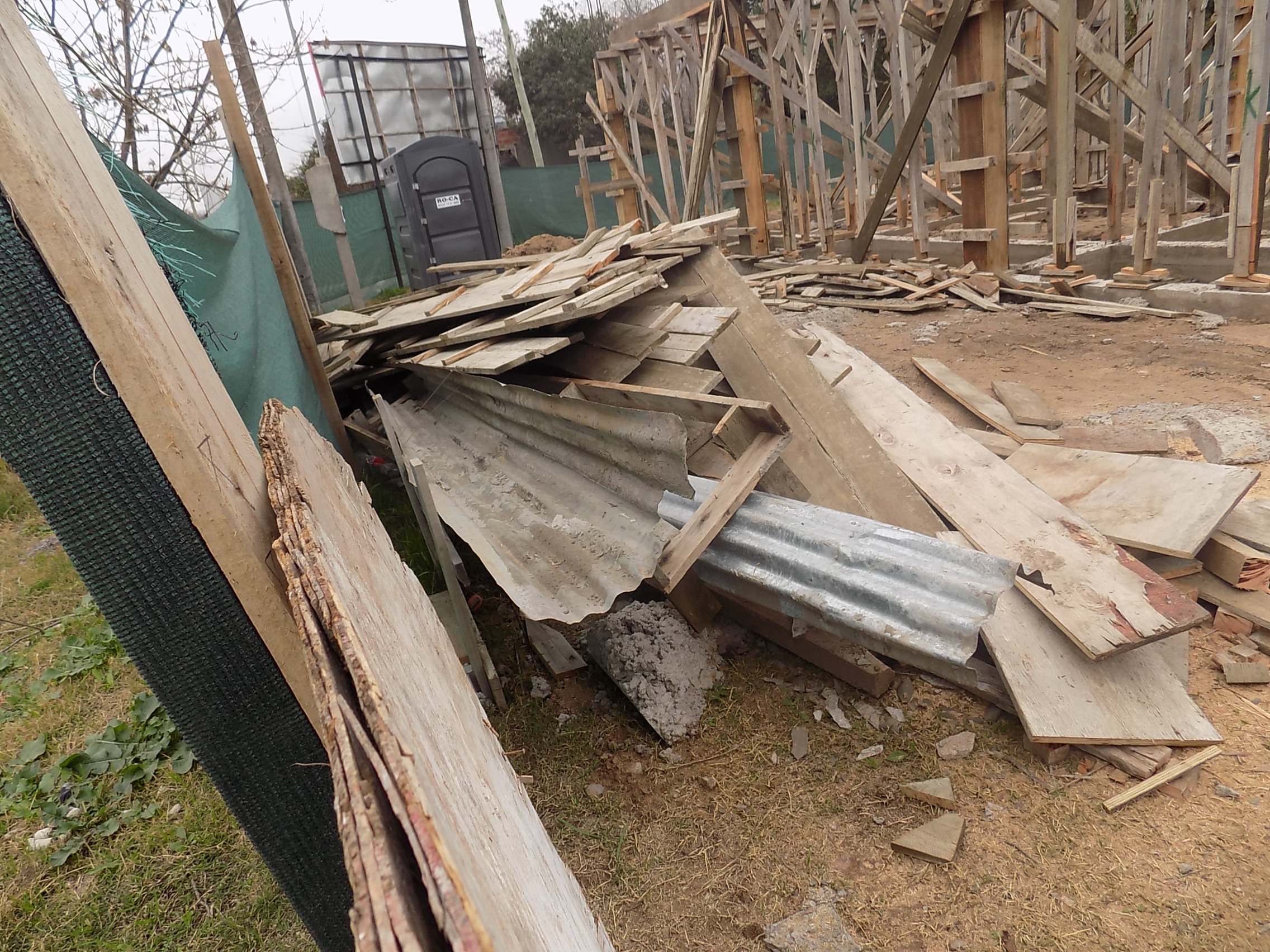 Como lo demuestran las imágenes, el desastre de seguridad era total, tirantes desparramados por cualquier lugar, los cortes de paneles de encofrado, diseminados por doquier. Se pueden ver maderas con clavos sin asegurar, que no se los claven, es un milagro.