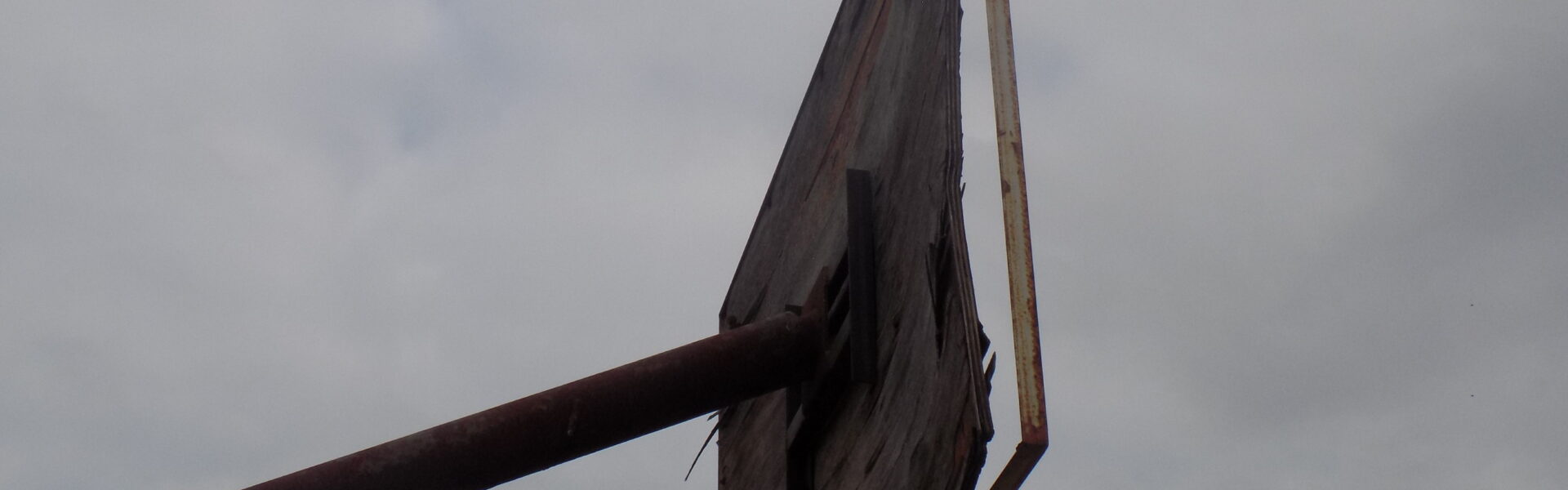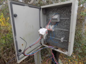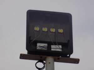 El tablero de luces, con cables arrancados, abierto, destruido, un equipo de luces que no existen, solo los postes que sostienen carcasas destruidas u corroídas.