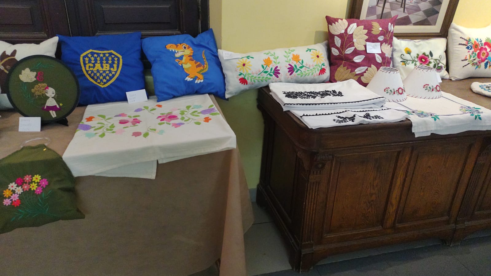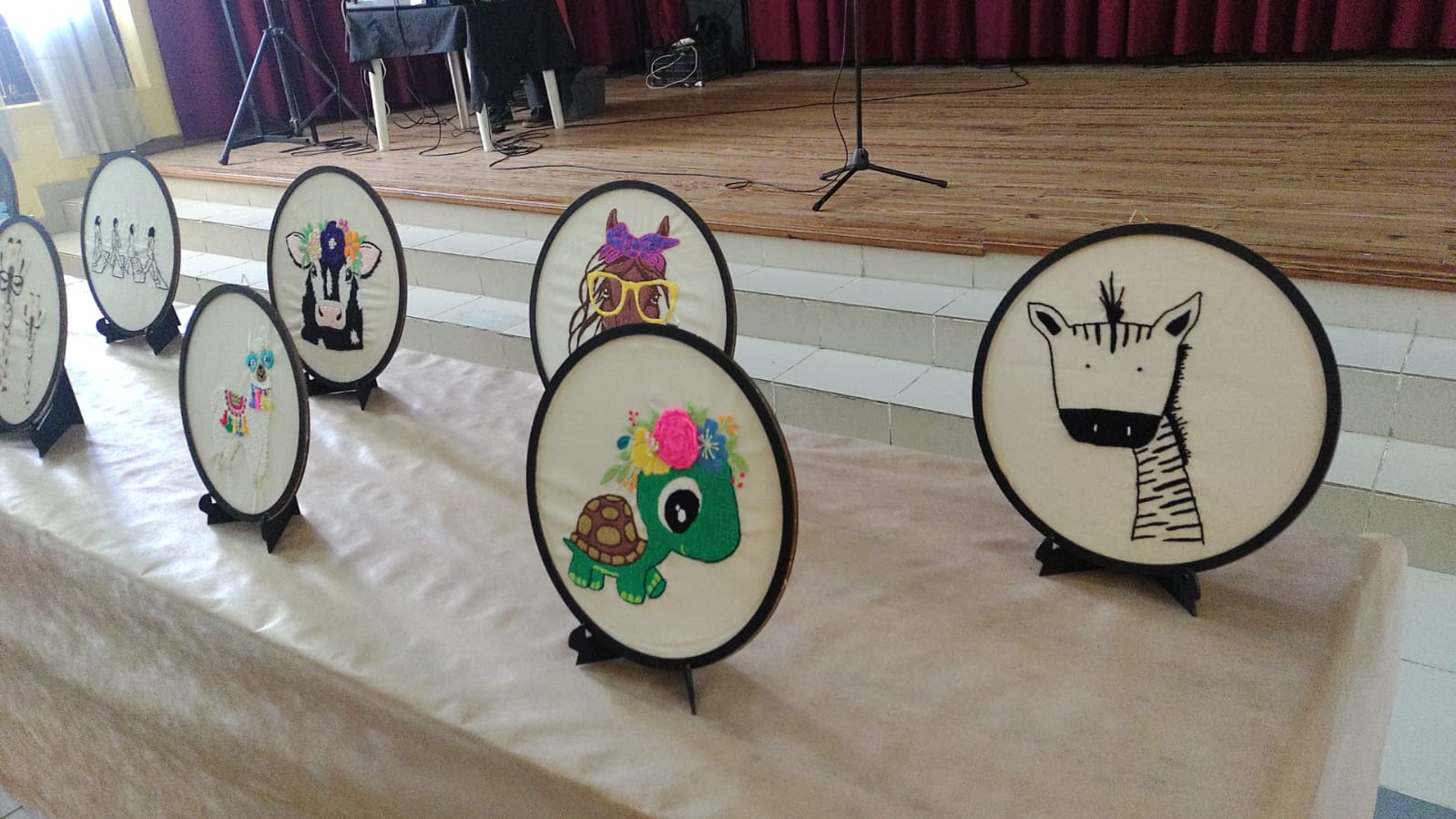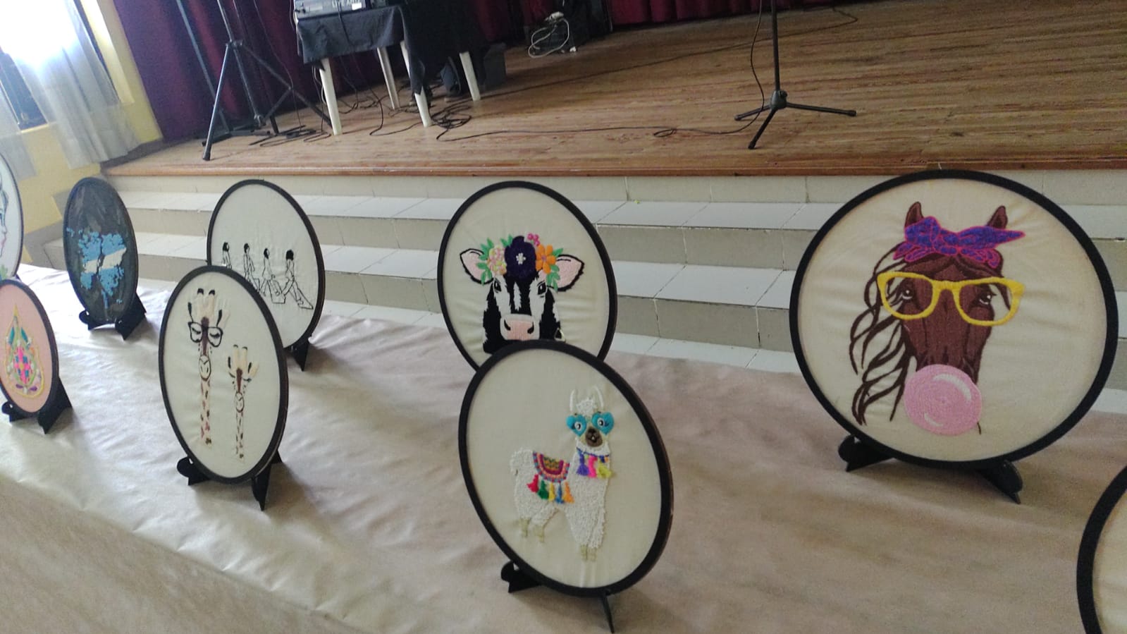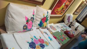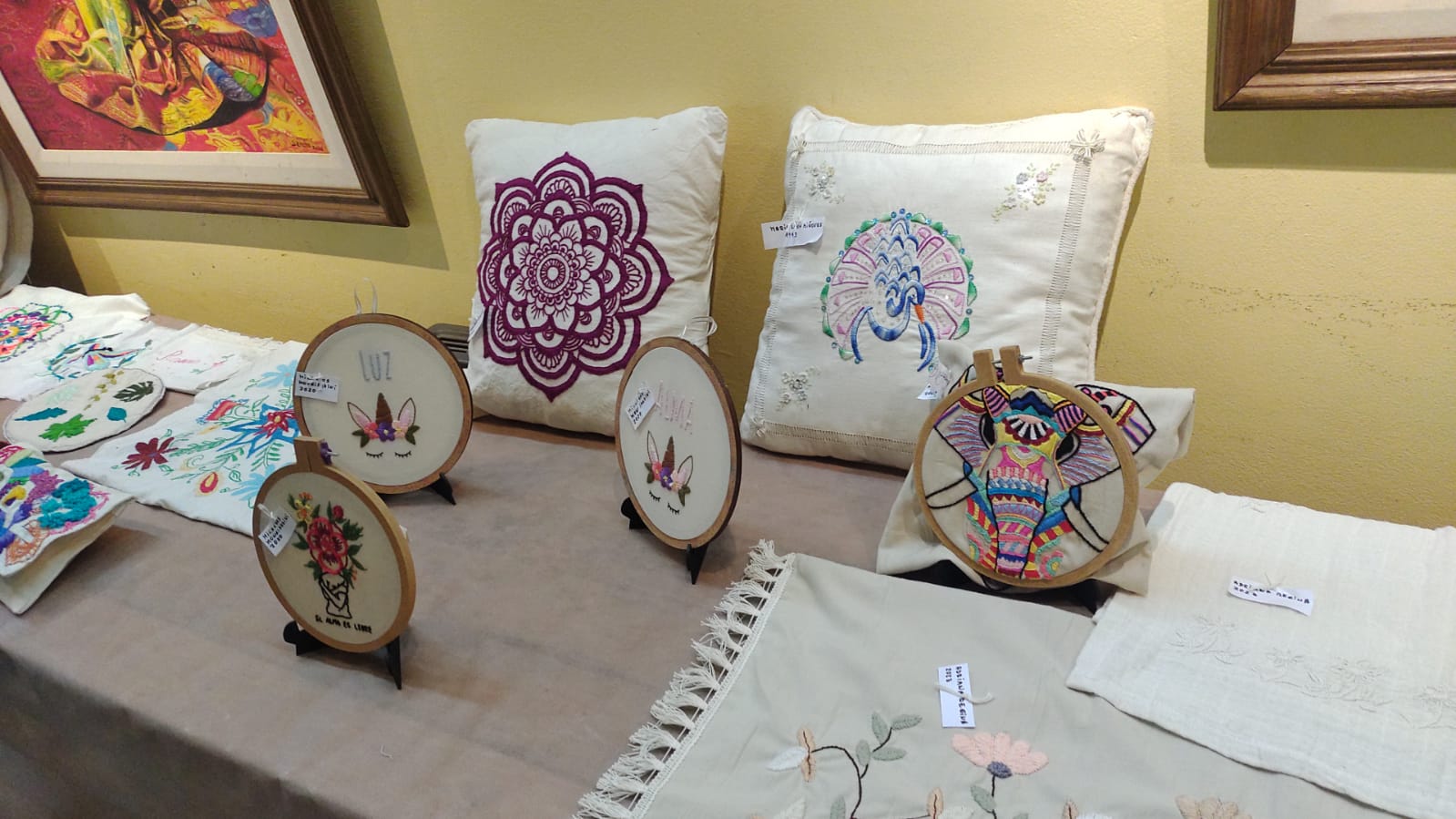 Exquisitos trabajos artísticos de fina confección de todo tipo de bordados sobre diferentes telas, distintos tipos de hilados y agujas, con sus atriles y caballetes que dejaban al descubierto toda la amalgama de diferentes técnicas impartidas por quien conduce los talleres de bordado a través de estos diez años.