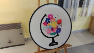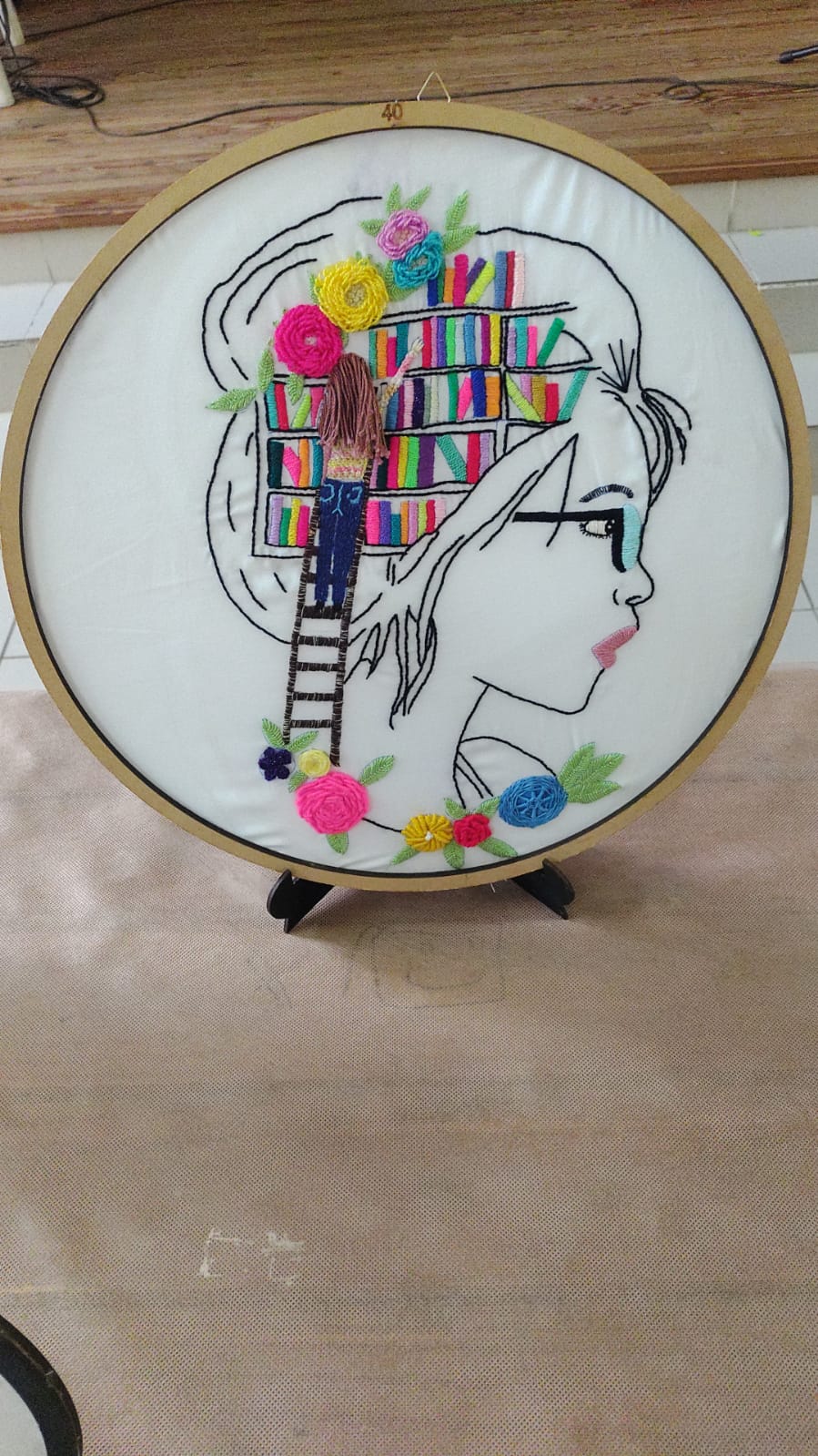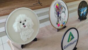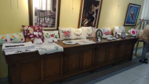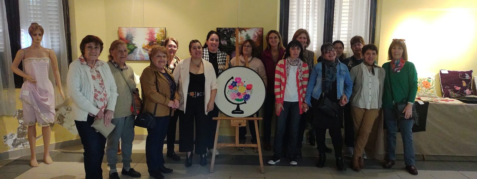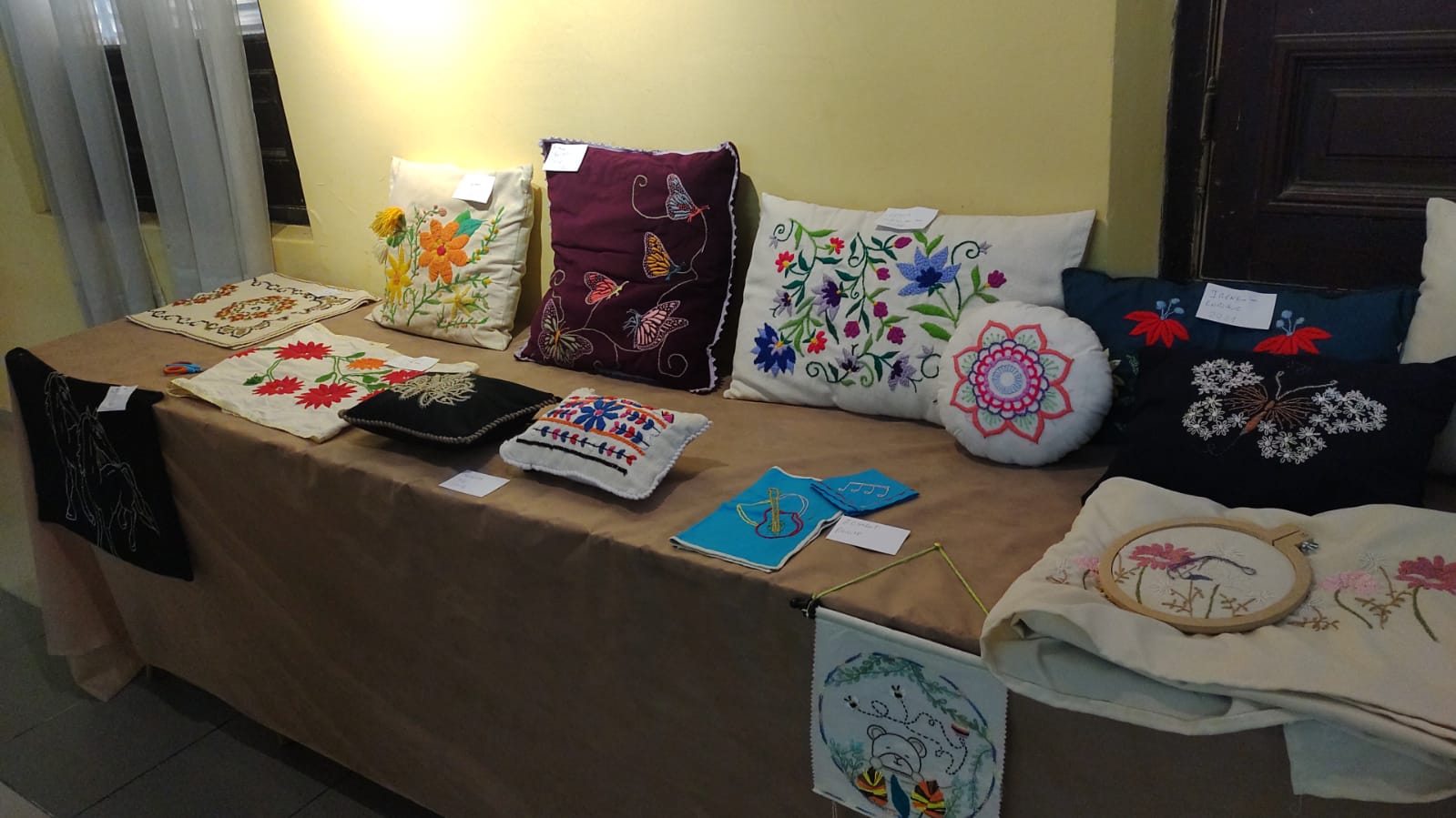 Exquisitos trabajos artísticos de fina confección de todo tipo de bordados sobre diferentes telas, distintos tipos de hilados y agujas, con sus atriles y caballetes que dejaban al descubierto toda la amalgama de diferentes técnicas impartidas por quien conduce los talleres de bordado a través de estos diez años.
