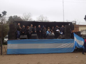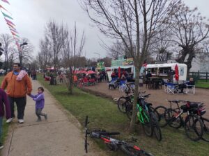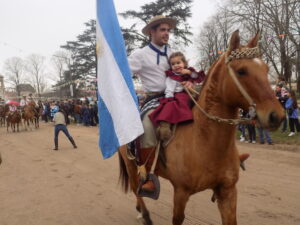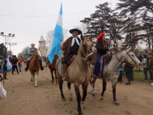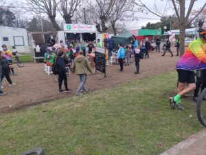 Desembocamos en un cuadro de película, un montón de gacebos, una inmensa feria con artesanos, plantas, carros de comidas, gente que va y que viene, chicos por doquier. Nos acercamos al palco de honor, la banda, los bomberos, mucha fuerza pública. Desfilan los paisanos, los chicos de Bici turismo de varias ciudades, por supuesto también están los de Lobos, vemos al infaltable DIRECTOR DE TURISMO DE LOBOS, IGNACIO SUAREZ, en su bicicleta con el grupo de ciclismo.