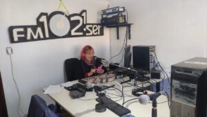 El estudio de emisión, donde estaba la infaltable Olga con las noticias del día. El chiche nuevo, una flamante consola que la están poniendo a punto, todo relucía, como la sonrisa a flor de labios de la locutora que alegra la mañana de muchos lobenses.