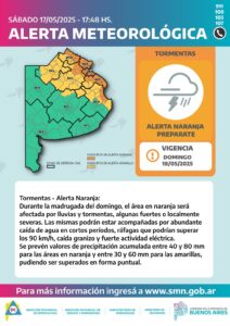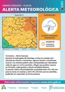 Durante la noche de hoy, los municipios del noreste de la provincia continuarán siendo afectados por lluvias y tormentas de variada intensidad, algunas fuertes o localmente severas. Las mismas estarán acompañadas por abundante caída de agua en cortos períodos, intensa actividad eléctrica, ráfagas que podrían acanzar los 100 km/h y ocasional caída de granizo. Se prevén valores de precipitación acumulada entre 30 y 60 mm durante este período.