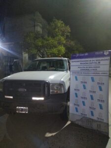 Personal de la Estación de Policía Comunal Lobos Seccional Primera, en horas de la madrugada de la fecha, procedió a interceptar en Ruta Nacional Nro. 205 Km. 98 de este medio, un rodado marca Ford modelo F4000 con caja de plancha de auxilio, el cual era abordado por 3 personas, dos masculinos de 32 y 25 años y una femenina de 19 años, todos domiciliados en la ciudad de 25 de Mayo. Dicho vehículo había sido sustraído horas antes en la localidad de 25 de Mayo, motivo por el cual se incoaron actuaciones judiciales por el delito de ROBO AGRAVADO AUTOMOTOR POR EL USO DE ARMA, dándose intervención a la U.F.I.J. Nro. 4 del Departamento Judicial de Mercedes.- Ante ello se procedió a efectivizar la Aprehensión de los ocupantes del rodado e incautación del vehículo sustraído como as también en el interior del mismo se secuestraron otros elementos como pasamontañas, cuchillos y el aparato de telefonía celular propiedad de la víctima del ilícito. Los aprehendidos en horas de la mañana fueron trasladados a la Comisaria de la ciudad de 25 de Mayo, donde posteriormente serán derivados por personal de esa Seccional a la Fiscalía de intervención a los fines de prestar declaración indagatoria.