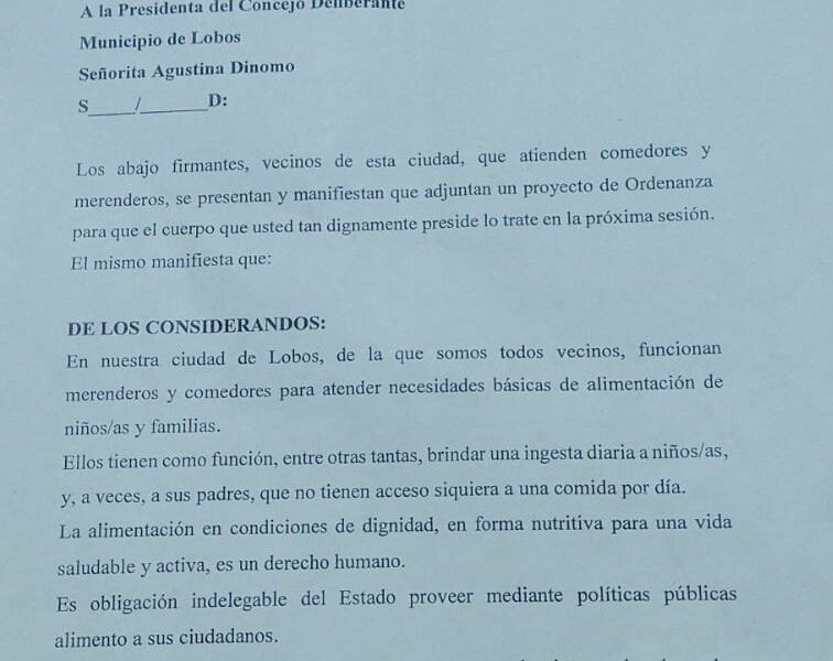 Es que, en la tarde noche de ayer miércoles, referentes de comedores y merenderos se presentaron en la mesa de entradas del CD, presentando un proyecto de ordenanza en la cual el núcleo fundamental es la declaración DE LA EMERGENCIA ALIMENTARIA EN LA CIUDAD.