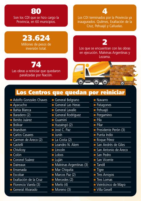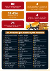 De los Centros de desarrollo infantil Cuatro ya fueron terminados. En rigor estaba prácticamente culminada la obra y faltaba el equipamiento, que en algunos casos fue cubierto por los municipios. Dos están en ejecución y otros 74 están programados para realizarse desde ahora al fin de la gestión en 2027.