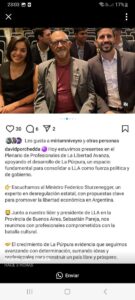 LLA, posteo en sus redes la reunión con el ministro de desregulación Sturzenegger, donde se lo ve sentado junto al coordinador de la agrupación violeta, Eduardo Portas. Allí hacen mención que esta agrupación es fundamental en la consolidación de esa fuerza política en la provincia.