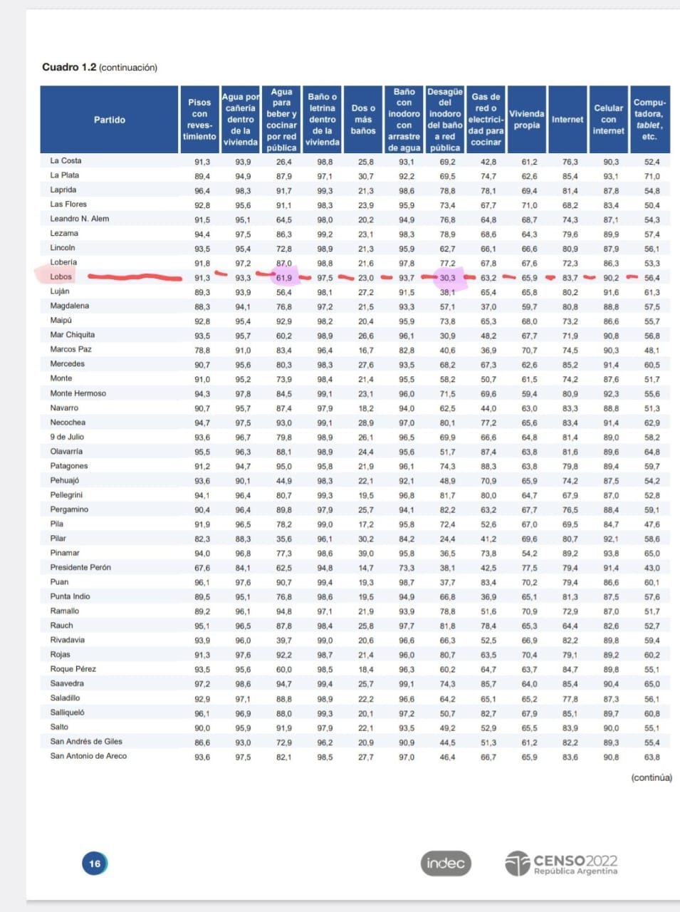 Estamos a punto de cumplir el primer cuarto del siglo XXI y, gracias a las gestiones mencionadas, en Lobos apenas el 61,9 % de los hogares tienen agua de red no potable y solo el 30% están conectados al servicio de cloacas.