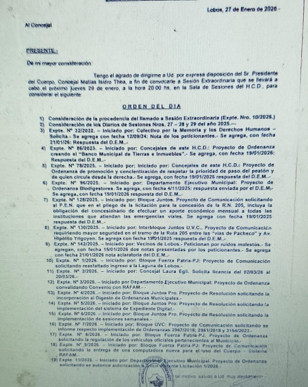 La misma está prevista para las 20 horas, se adjunta orden del día con 19 puntos a tratar.