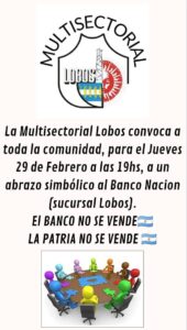 La MULTISECTORIAL Lobos invita a toda la ciudadanía lobense, a las instituciones privadas, sociales, deportivas, comerciales y de adultos mayores que se sientan consustanciadas con: EL BANCO NO SE VENDE, LA PATRIA NO SE VENDE, a expresarse con su presencia.