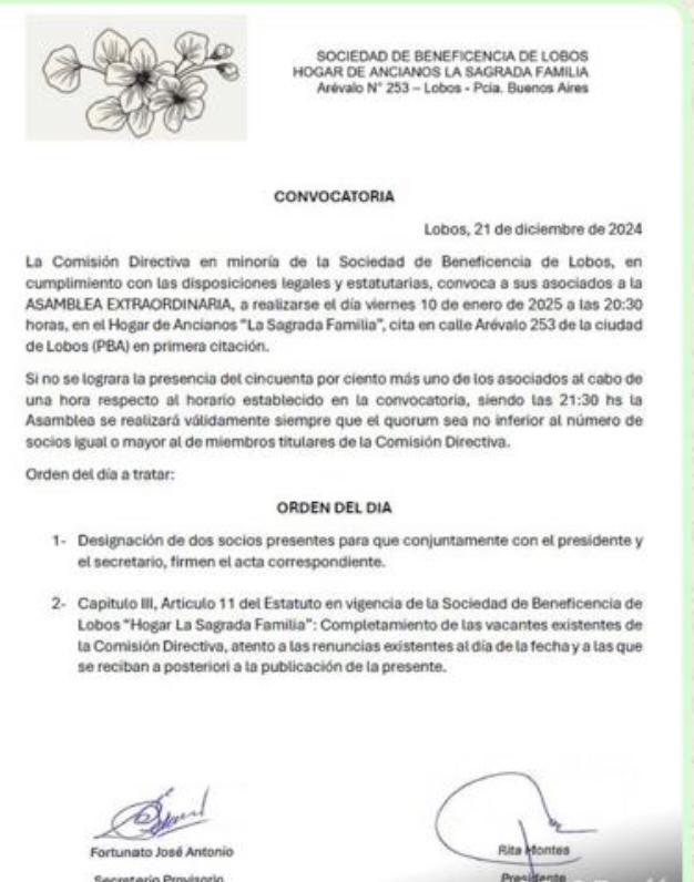 NUEVO LLAMADO A ASAMBLEA GENERAL EXTRAORDINARIA DEL ASILO DE ANCIANOS