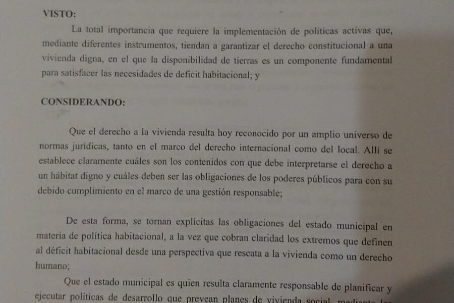 La total importancia que requiere la implementación de políticas activas que, mediante diferentes instrumentos, tiendan a garantizar el derecho constitucional a una vivienda digna, en el que la disponibilidad de tierras es un componente fundamental para satisfacer las necesidades de deficit habitacional; y