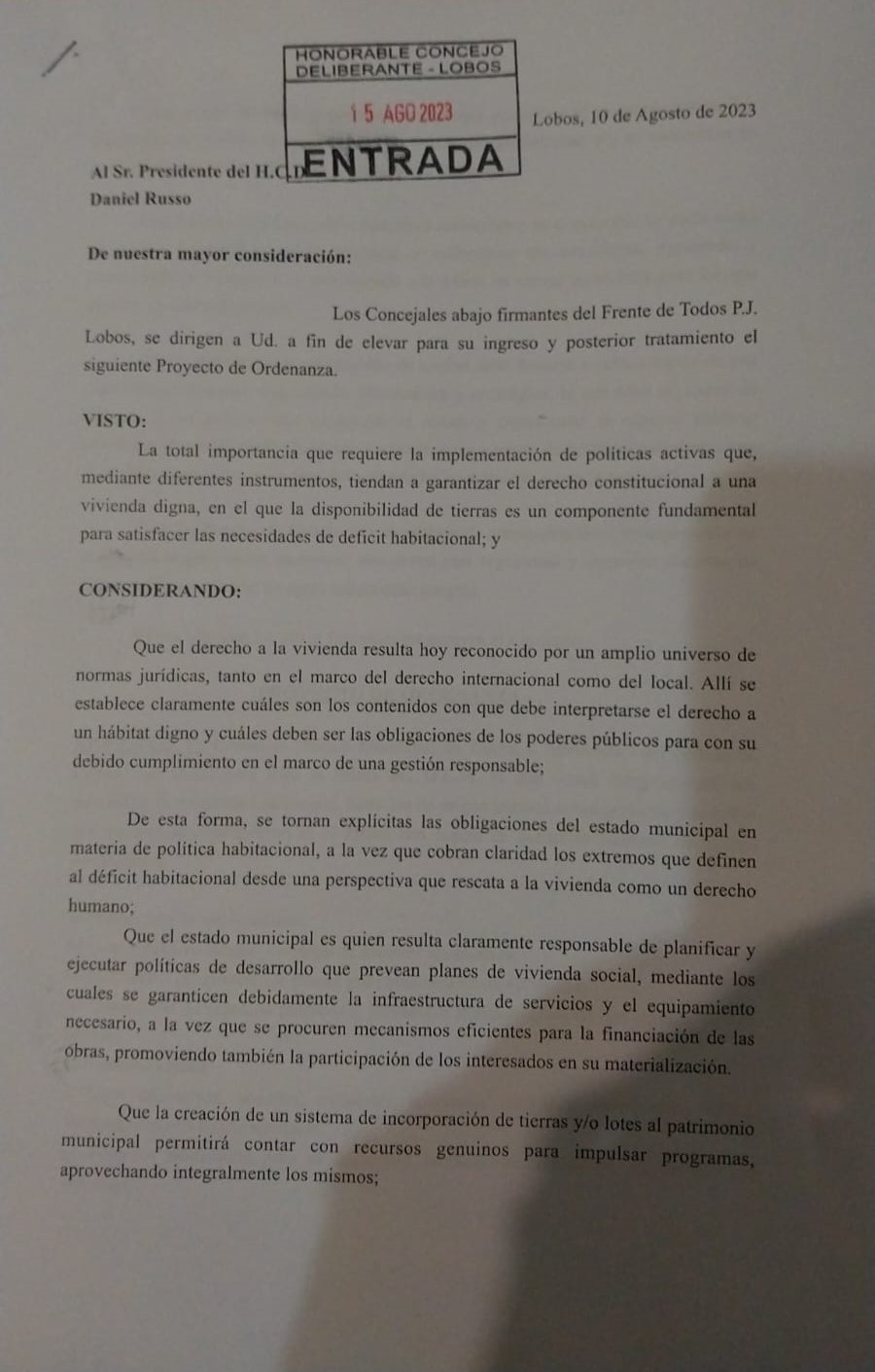 Esta semana desde el espacio del PJ Lobos, los concejales Thea, Robles, Sperr y Cirone, han presentado un proyecto de Ordenanza que busca regularizar la situación local de tierras e inmuebles existentes en el partido de Lobos.