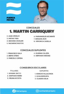 La misma la integra como primer concejal MARTÍN CARRPQUIRY, lo acompaña en el segundo lugar Alba Virgilio, en el tercero Matías Thea, el cuarto lugra, estará Bahiana Cavalleri, Nazareno Bustos para el quinto, el sexto Mariángeles Azc;arate, el séptimo Ezequiel Buis, mientras que en el octavo estará Verónica Casella.