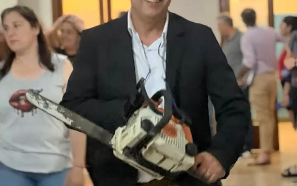 Allí se lo ve al coordinador Fabrizio Martínez esgrimiendo la citada motosierra, mientras en una edición MUY AJENA A LA REALIDAD, se ve a simpatizantes de LLA, colmando las instalaciones del CD.