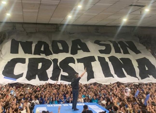 Con el tema de los Redonditos de Ricota, «JiJiJi» y, una inmensa bandera de CRISTINA, Máximo subió al escenario para comenzar a hablarle a las casi 6000 personas que colmaban el estadio de ATENAS.
