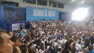 Con los militantes que, durante las dos horas que esperaron el inicio de las palabras del Líder de la Cámpora, enfervorizados con cánticos de neto corte camporista, comenzó el acto exhibiéndose con un video de Néstor y CFK hablándole al pueblo y Macri pidiéndole dinero al FMI.